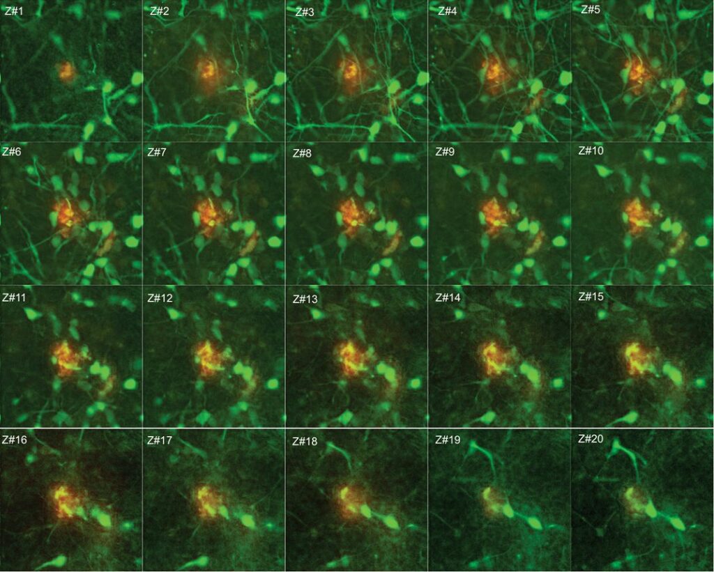 ABOVE: In Tanzi and Kim’s lab, brain cells growing in 3-D in a dish harbor genes for familial Alzheimer’s disease. Each of these microscope images shows a different level of focus on a neuron cluster (green) and toxic amyloid plaque (yellow/orange). (IMAGE SOURCE: Dr. Doo Yeon Kim and Dr. Rudolph Tanzi, Massachusetts General Hospital)