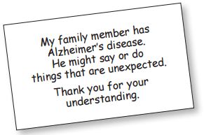 - Use a business-size card to tell others about the person’s disease. Sharing this information with store clerks or restaurant staff can make outings more comfortable for everyone. My family member has Alzheimer’s disease. He might say or do things that are unexpected. Thank you for your understanding.